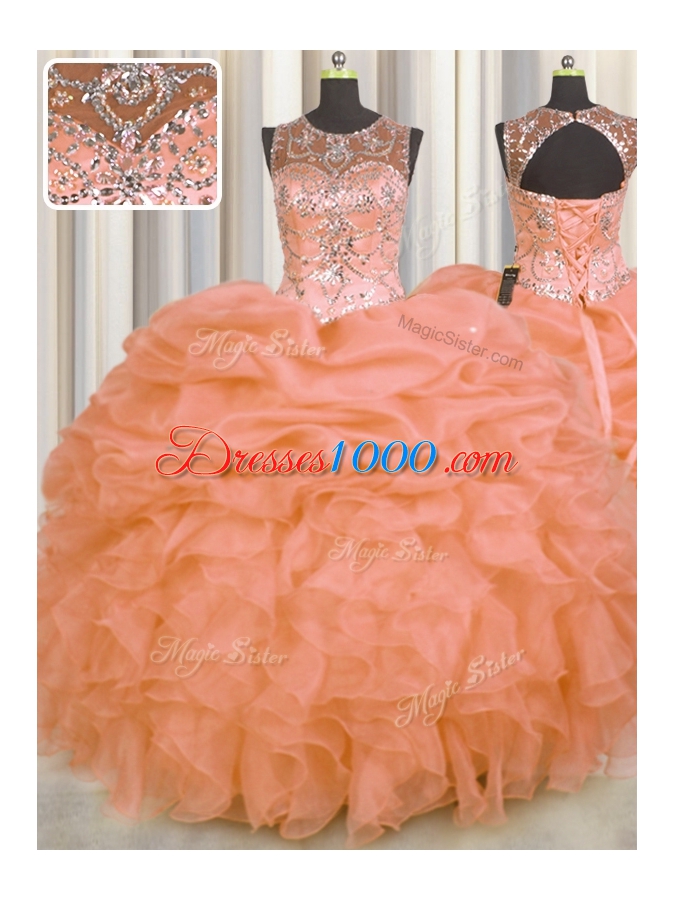 Fantastic See Through Beading and Ruffles and Pick Ups Quinceanera Gown Orange Lace Up Sleeveless Floor Length
