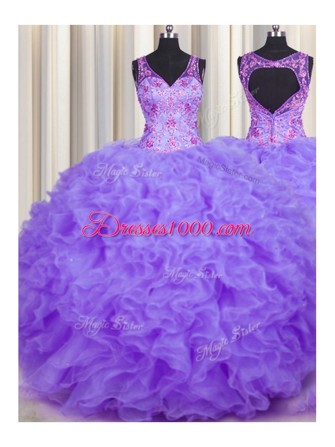 V Neck Lavender Sleeveless Floor Length Beading and Appliques and Ruffles Backless 15th Birthday Dress