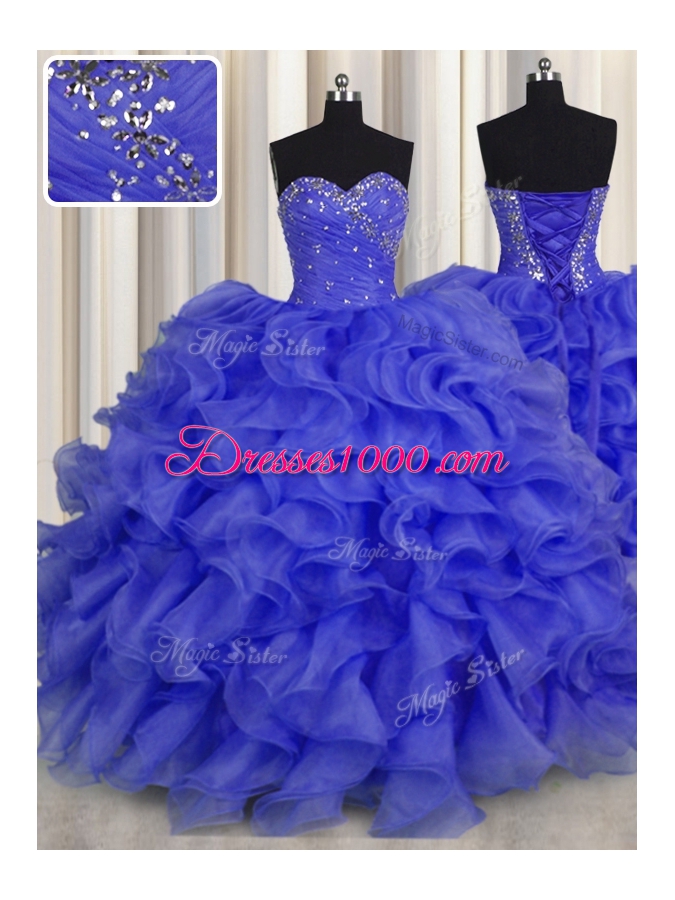 Floor Length Royal Blue Sweet 16 Quinceanera Dress Organza Sleeveless Beading and Ruffles