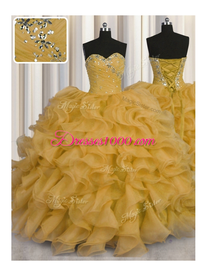 Custom Fit Gold Ball Gowns Sweetheart Sleeveless Organza Floor Length Lace Up Beading and Ruffles 15th Birthday Dress