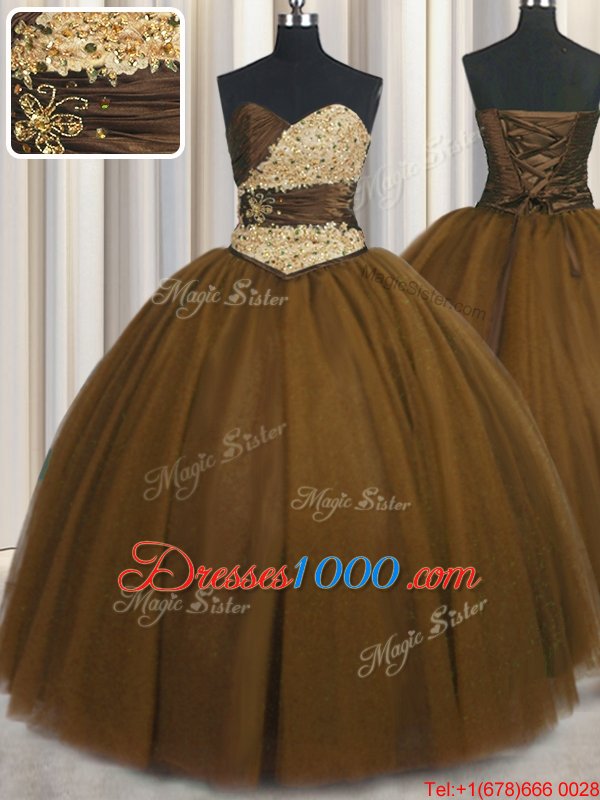 Custom Designed Brown 15 Quinceanera Dress Military Ball and Sweet 16 and Quinceanera and For with Beading and Appliques and Ruching and Belt Sweetheart Sleeveless Lace Up