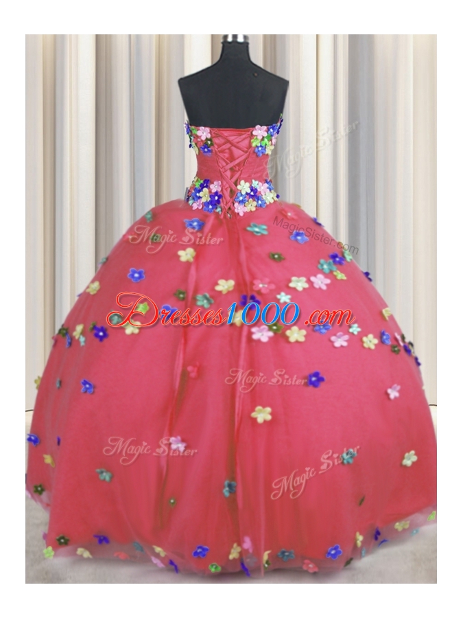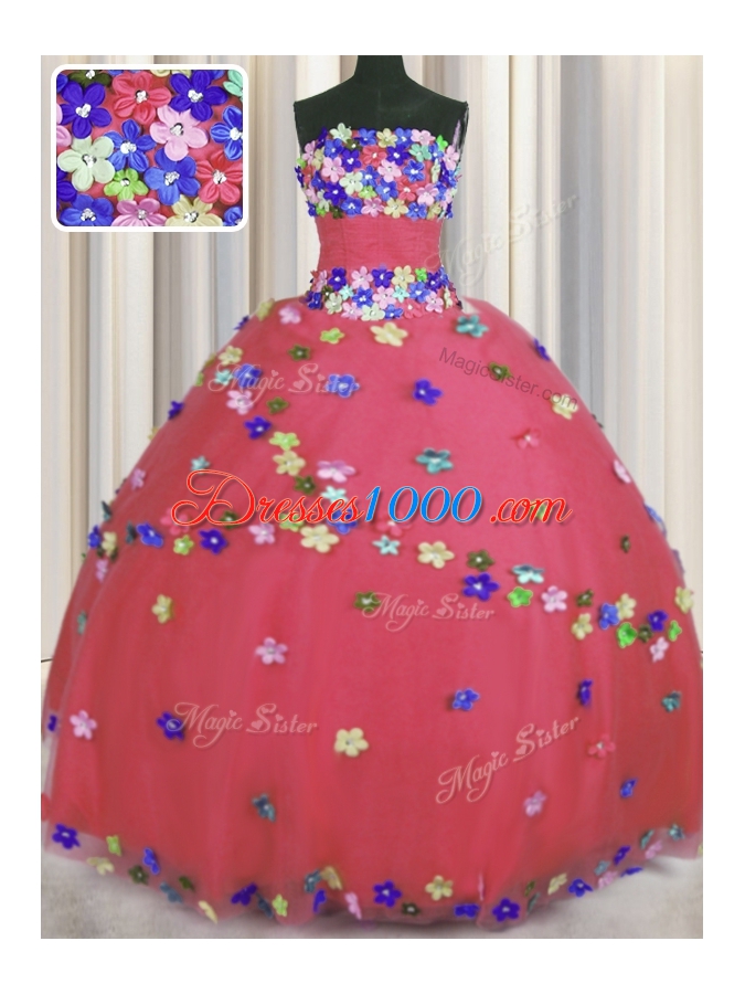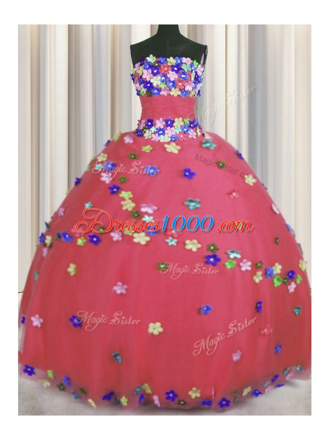 Most Popular Coral Red Strapless Neckline Hand Made Flower Quinceanera Dress Sleeveless Lace Up