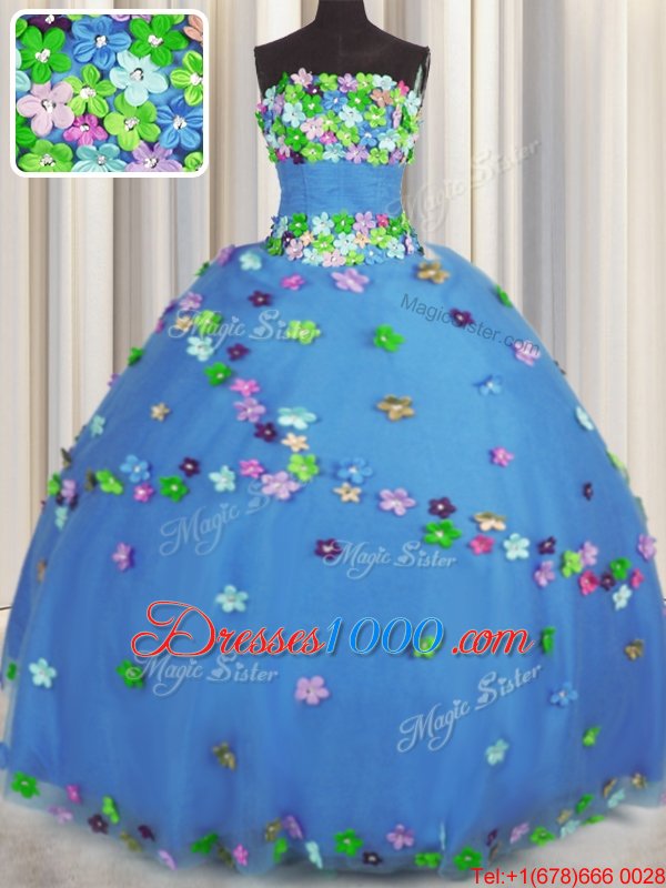 Cute Sleeveless Floor Length Hand Made Flower Lace Up Sweet 16 Dress with Blue