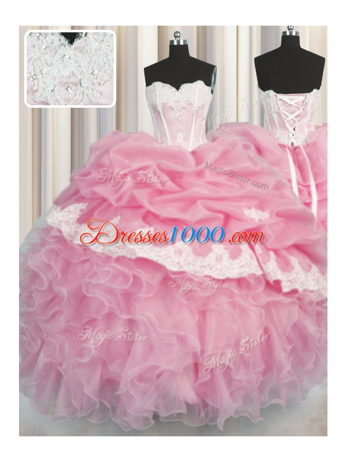Rose Pink Ball Gown Prom Dress Military Ball and Sweet 16 and Quinceanera and For with Beading and Appliques and Ruffles and Pick Ups Sweetheart Sleeveless Lace Up