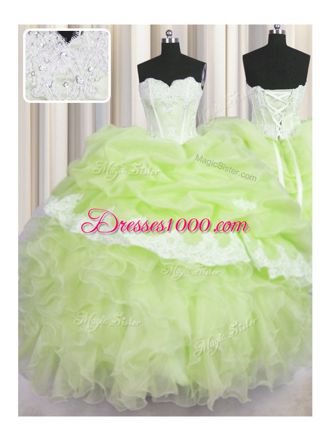 Fantastic Floor Length Yellow Green Quince Ball Gowns Organza Sleeveless Beading and Appliques and Ruffles and Pick Ups