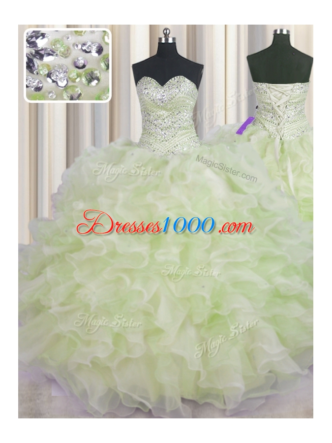 Deluxe Yellow Green Ball Gowns Beading and Ruffles Quince Ball Gowns Lace Up Organza Sleeveless Floor Length