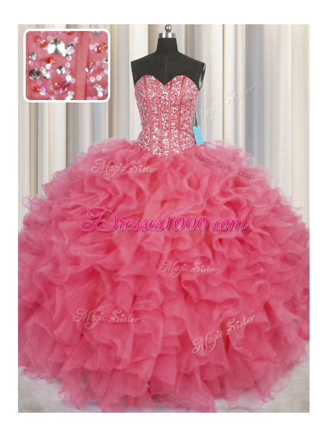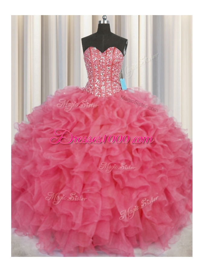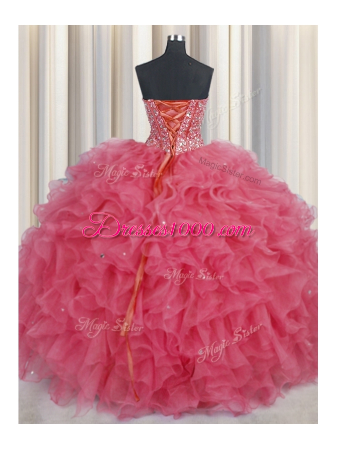 Visible Boning Coral Red Sweetheart Lace Up Beading and Ruffles Quinceanera Gowns Sleeveless
