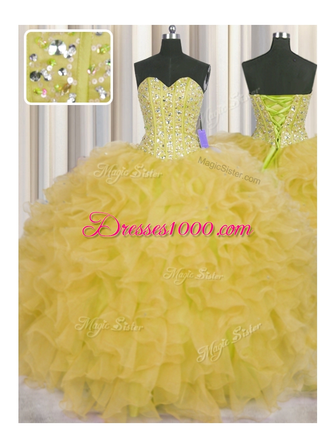 Flirting Visible Boning Floor Length Lace Up Sweet 16 Dress Yellow and In for Military Ball and Sweet 16 and Quinceanera with Beading and Ruffles and Sashes|ribbons
