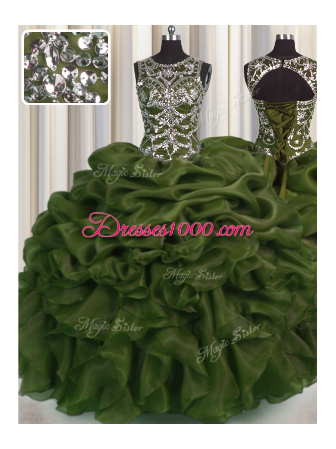 See Through Olive Green Organza Lace Up Scoop Sleeveless Floor Length Sweet 16 Quinceanera Dress Beading and Pick Ups