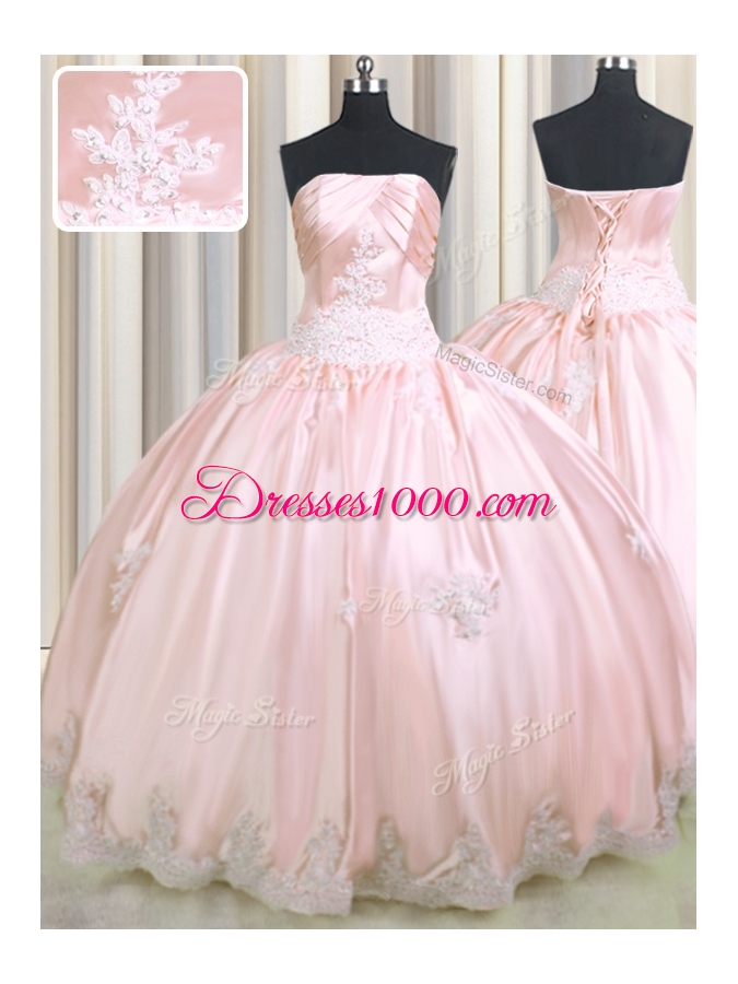 Romantic Baby Pink Ball Gowns Taffeta Strapless Sleeveless Beading and Appliques Floor Length Lace Up Vestidos de Quinceanera