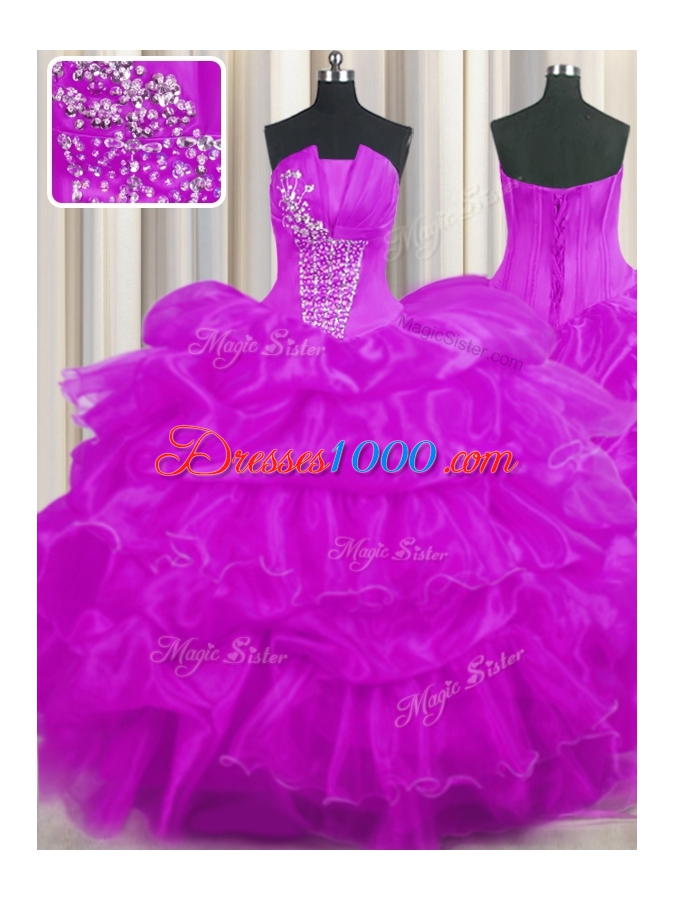 Dramatic Organza Sleeveless Floor Length Quince Ball Gowns and Beading and Ruffled Layers and Pick Ups