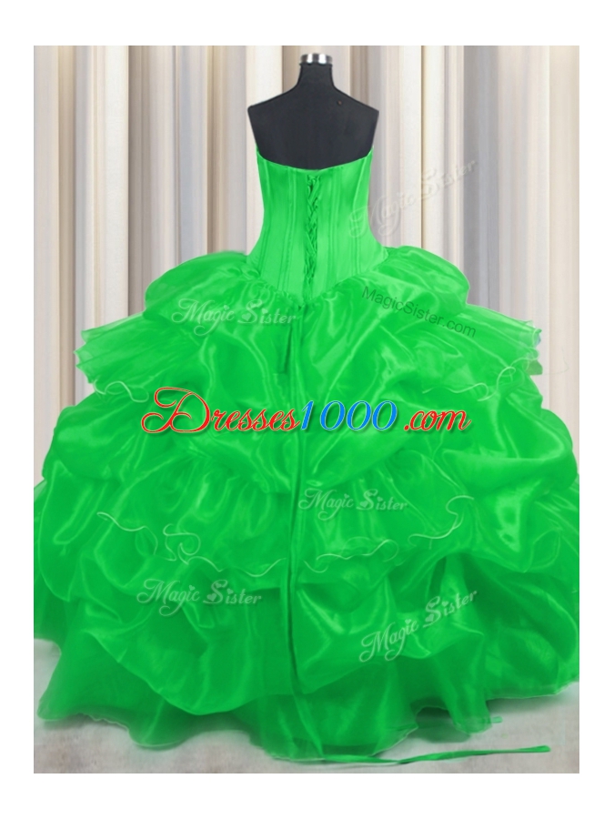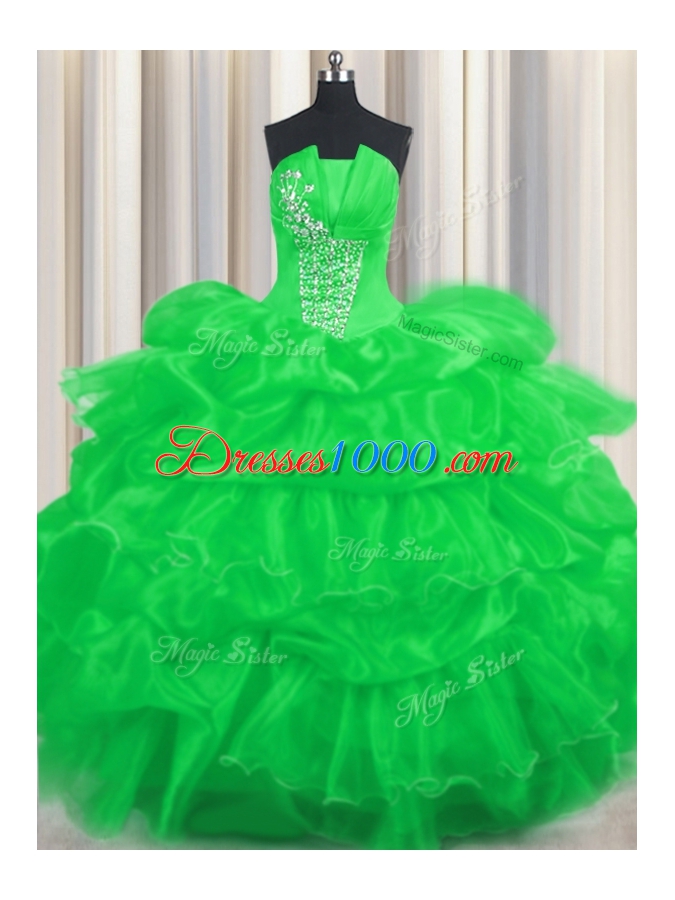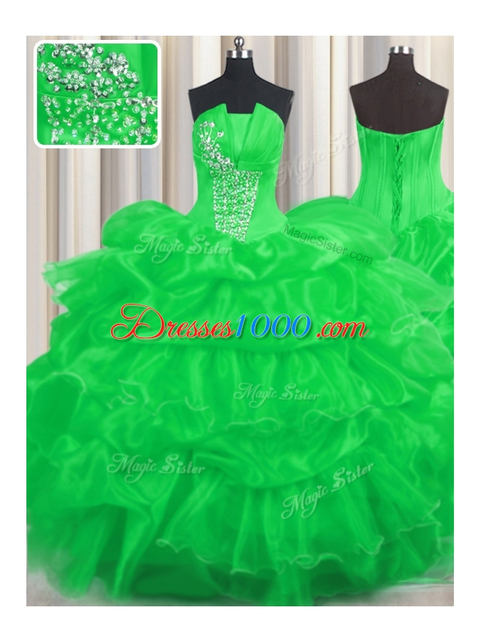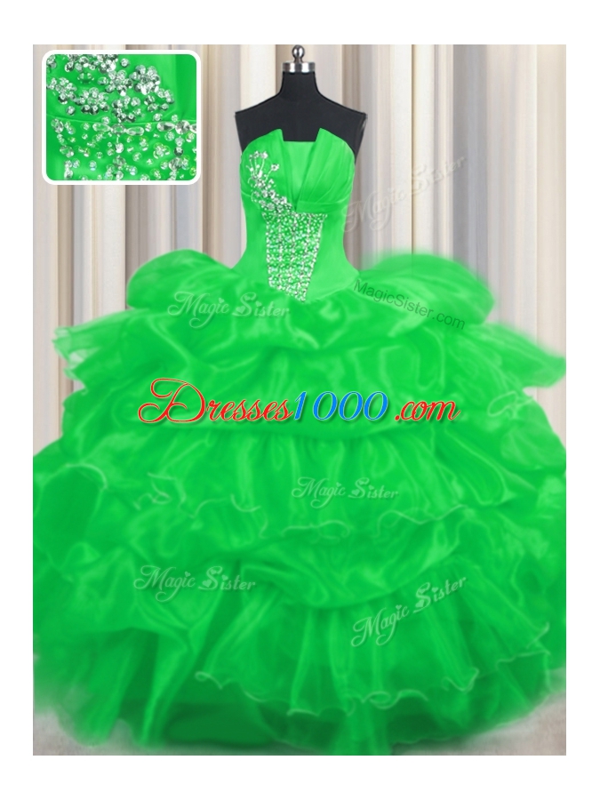 Strapless Sleeveless Sweet 16 Quinceanera Dress Floor Length Beading and Ruffled Layers and Pick Ups Green Organza