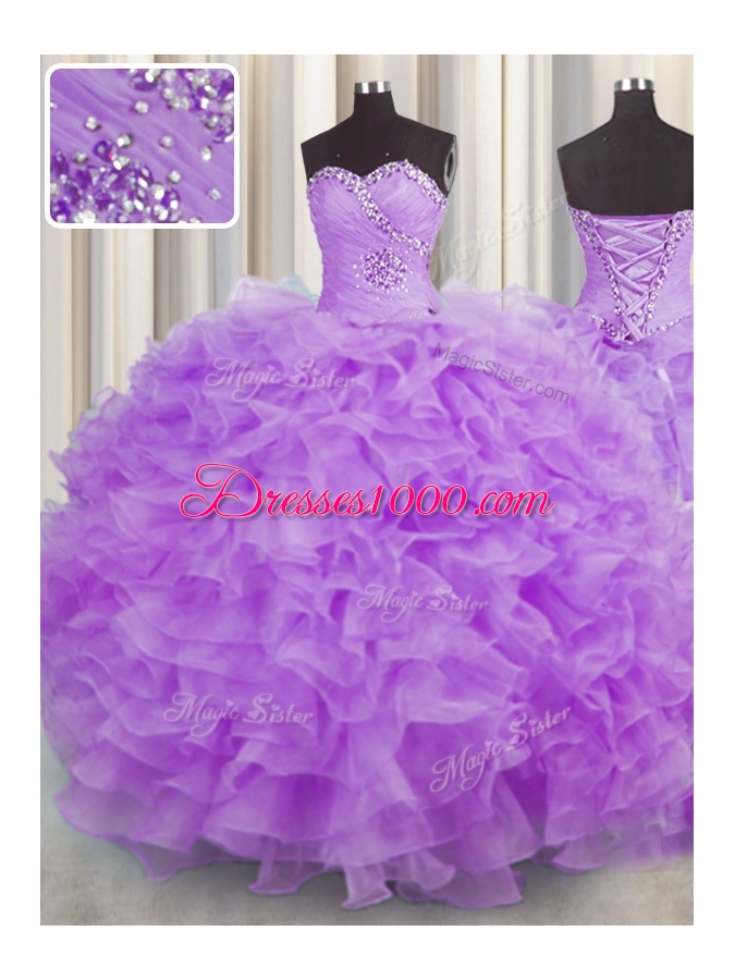 Beauteous Organza Sweetheart Sleeveless Lace Up Beading and Ruffles Quinceanera Dress in Lilac