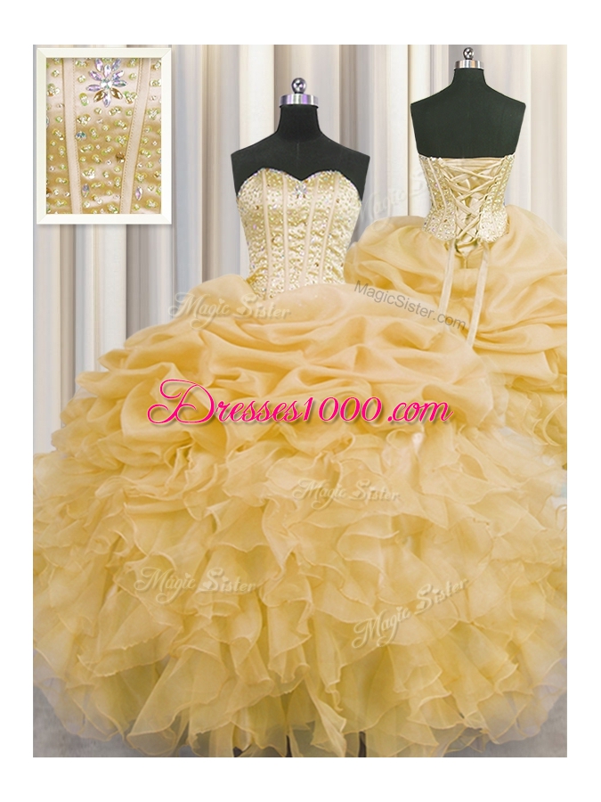 On Sale Pick Ups Visible Boning Ball Gowns Quinceanera Gowns Gold Sweetheart Organza Sleeveless Floor Length Lace Up