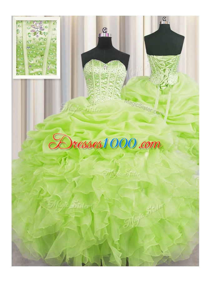 Traditional Pick Ups Visible Boning Ball Gowns Quince Ball Gowns Yellow Green Sweetheart Organza Sleeveless Floor Length Lace Up