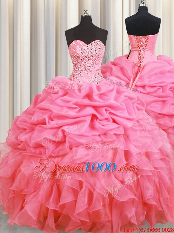 Fantastic Halter Top Rose Pink Ball Gowns Beading and Ruffles and Pick Ups Sweet 16 Dress Lace Up Organza Sleeveless Floor Length