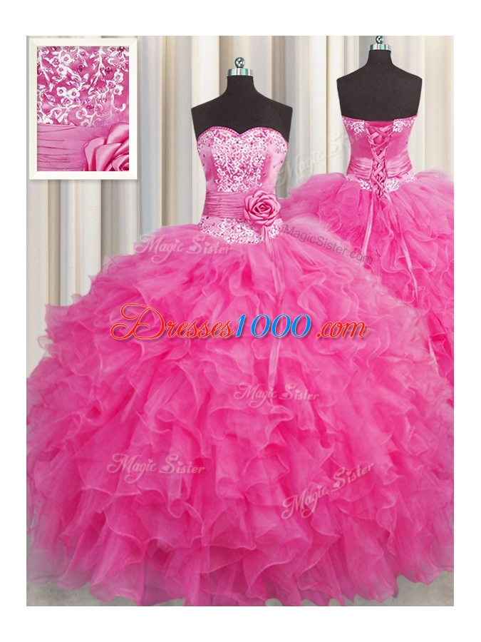 Cheap Handcrafted Flower Hot Pink Sweetheart Neckline Beading and Ruffles Ball Gown Prom Dress Sleeveless Lace Up