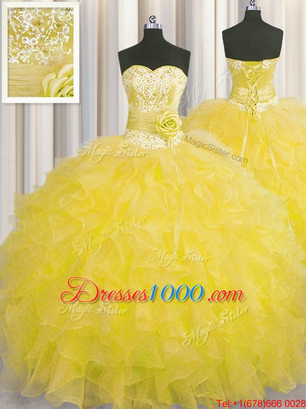 Cheap Handcrafted Flower Sweetheart Sleeveless Lace Up Quinceanera Gown Gold Organza