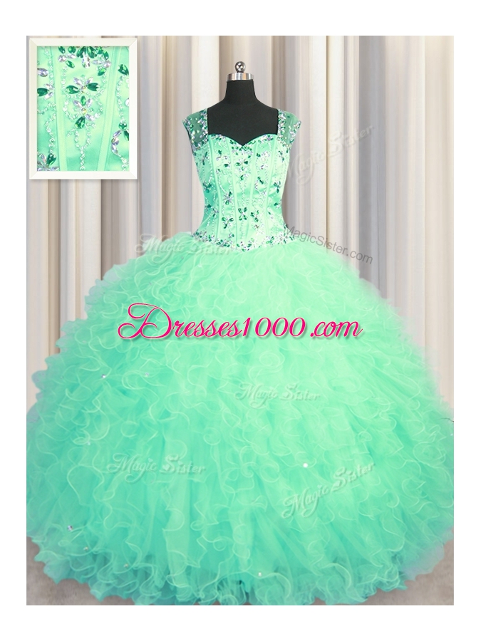 Cheap See Through Zipper Up Turquoise Sleeveless Beading and Ruffles Floor Length Ball Gown Prom Dress
