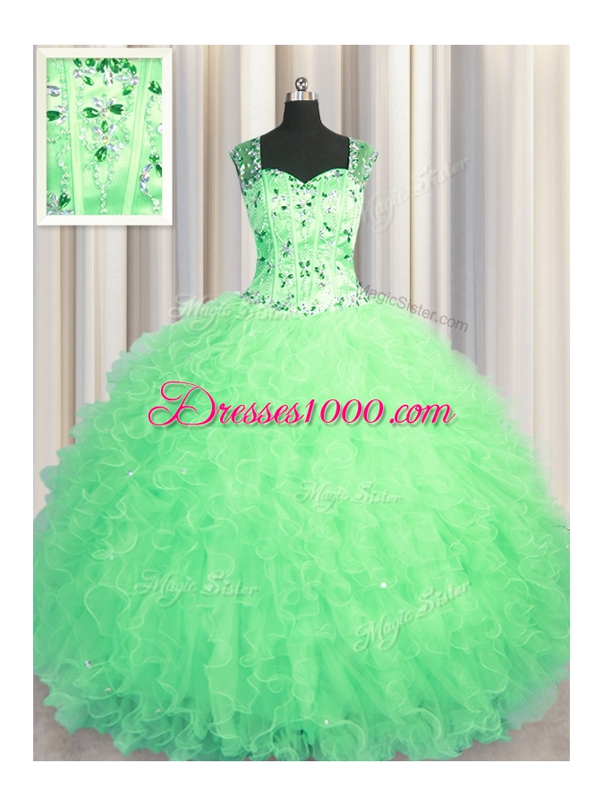 See Through Zipper Up Straps Sleeveless Sweet 16 Quinceanera Dress Floor Length Beading and Ruffles Apple Green Tulle