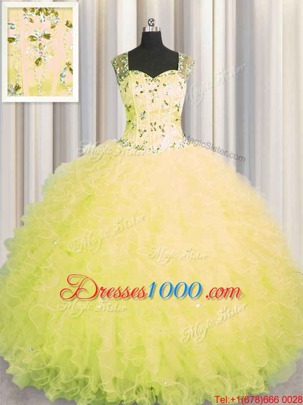 See Through Zipper Up Sleeveless Tulle Floor Length Zipper Quinceanera Gowns in Yellow for with Beading and Ruffles