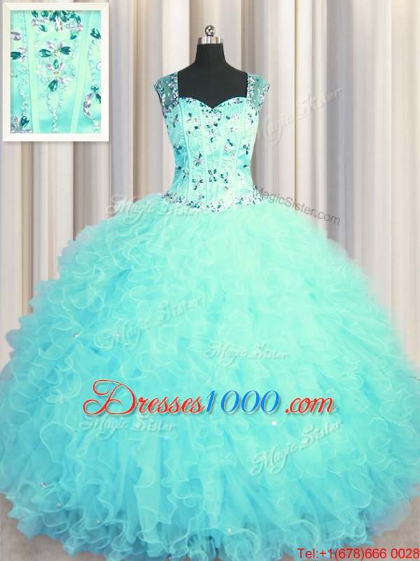Custom Made See Through Zipper Up Aqua Blue Sleeveless Beading and Ruffles Floor Length Quinceanera Dresses