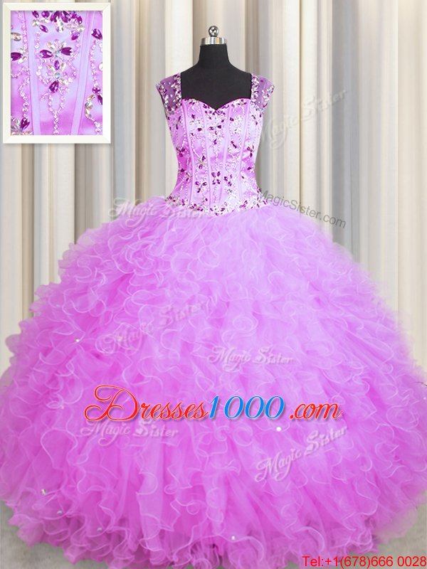 Fitting See Through Zipper Up Sleeveless Floor Length Beading and Ruffles Zipper Quinceanera Dresses with Lilac