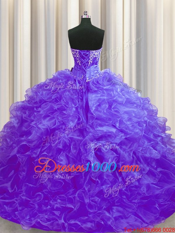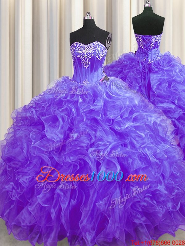 Purple Lace Up Quinceanera Dresses Beading and Ruffles Sleeveless Brush Train