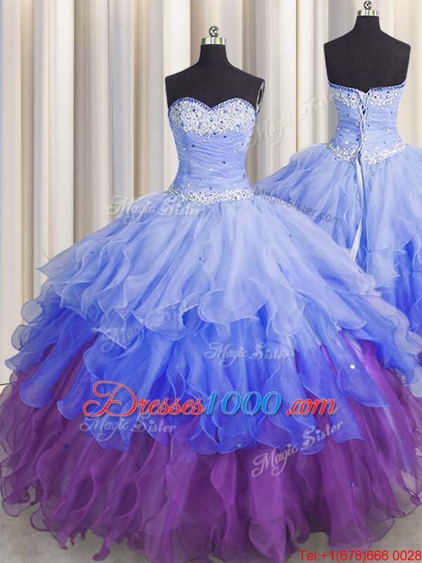 Cute Floor Length Multi-color 15th Birthday Dress Organza Sleeveless Beading and Ruffles and Ruffled Layers and Sequins