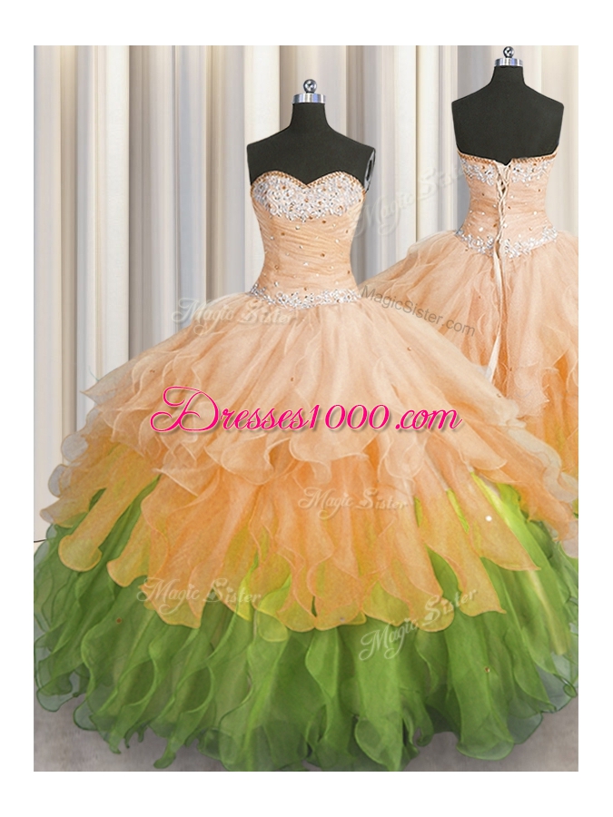 Sweetheart Sleeveless Organza 15th Birthday Dress Beading and Ruffles and Ruffled Layers and Sequins Lace Up