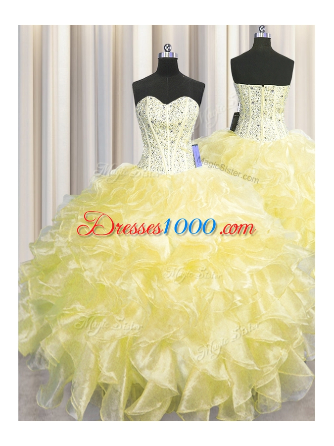 Visible Boning Zipper Up Sleeveless Organza Floor Length Zipper Vestidos de Quinceanera in Light Yellow for with Beading and Ruffles