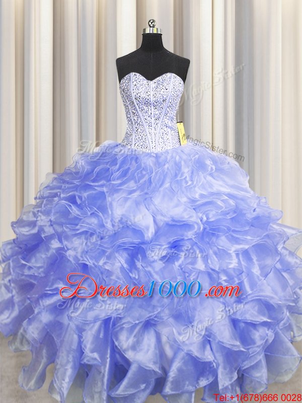 Visible Boning Zipper Up Lavender Sleeveless Floor Length Beading and Ruffles Zipper Ball Gown Prom Dress