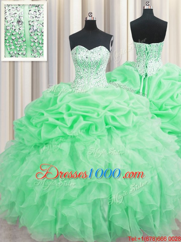Pick Ups Visible Boning Ball Gowns Quinceanera Dress Apple Green Sweetheart Organza Sleeveless Floor Length Lace Up