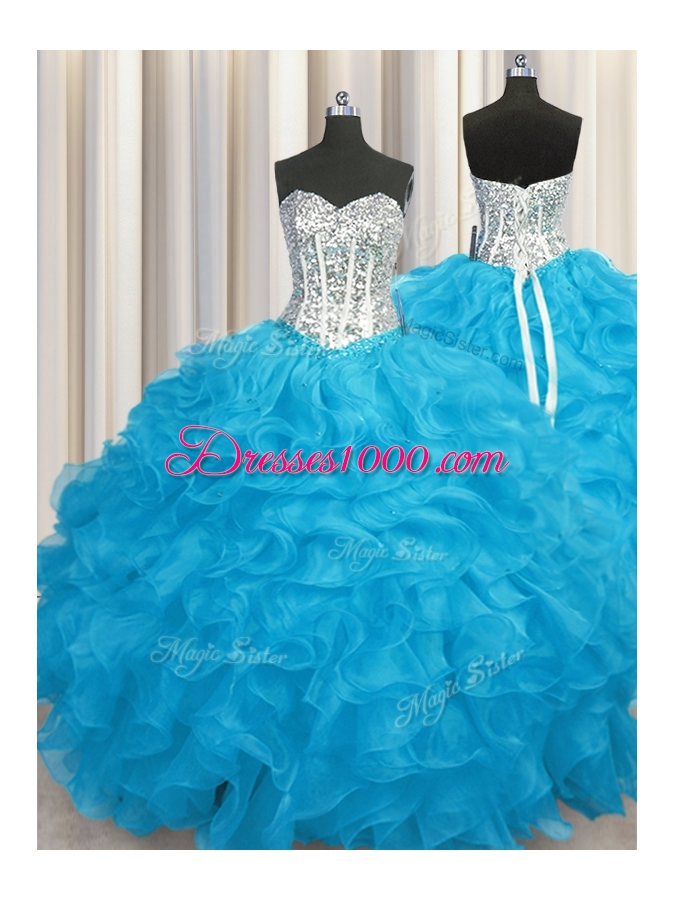 Aqua Blue Sweetheart Neckline Beading and Ruffles 15th Birthday Dress Long Sleeves Lace Up