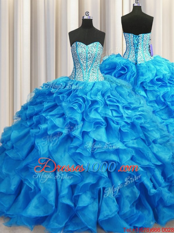 Visible Boning Baby Blue Ball Gowns Beading and Ruffles Sweet 16 Quinceanera Dress Lace Up Organza Sleeveless
