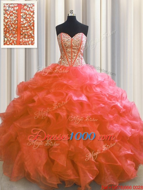 Visible Boning Ball Gowns Quince Ball Gowns Red Sweetheart Organza Sleeveless Floor Length Lace Up