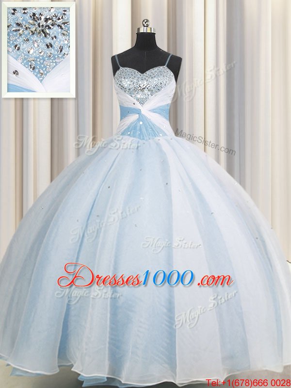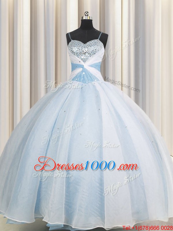 Trendy Spaghetti Straps Floor Length Lace Up 15 Quinceanera Dress Light Blue and In for Military Ball and Sweet 16 and Quinceanera with Beading and Ruching