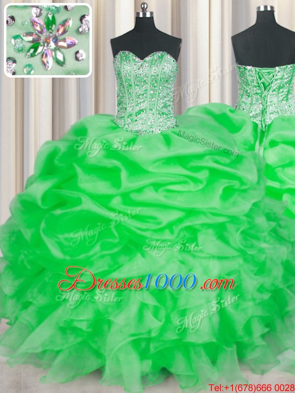 Sleeveless Floor Length Beading and Ruffles Lace Up 15th Birthday Dress with Green