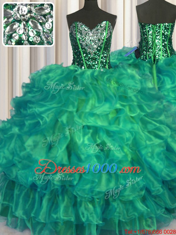 Turquoise Sweetheart Lace Up Beading and Ruffles Ball Gown Prom Dress Sleeveless
