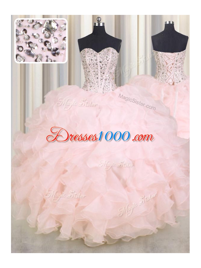Customized Baby Pink Ball Gowns Beading and Ruffles Quinceanera Gowns Lace Up Organza Sleeveless Floor Length