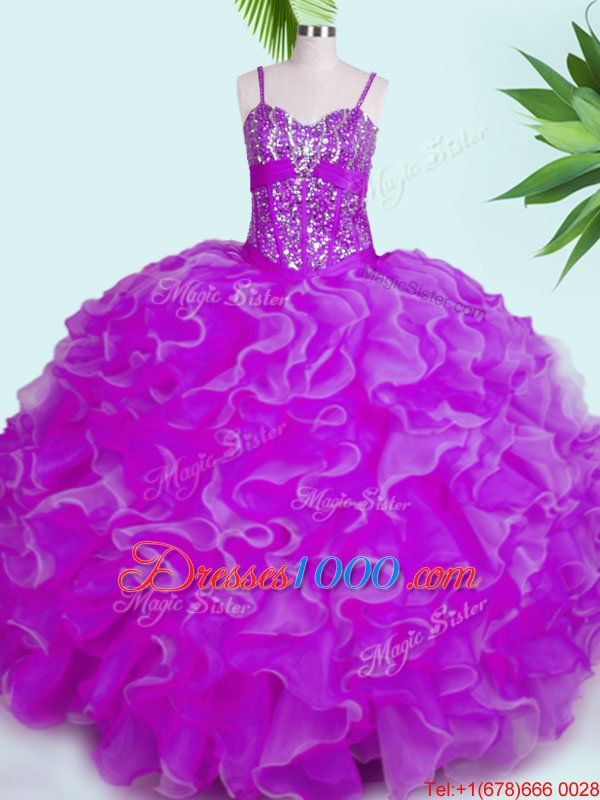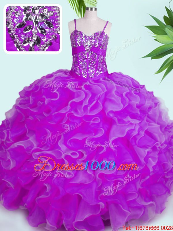 Fuchsia Lace Up Spaghetti Straps Beading and Ruffles Ball Gown Prom Dress Organza Sleeveless