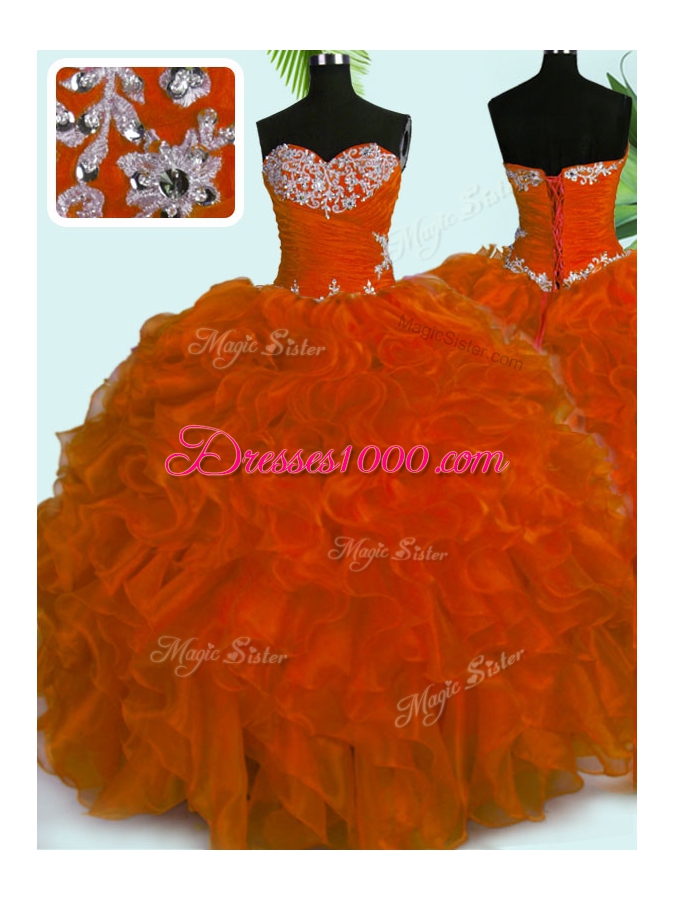 Fine Sweetheart Sleeveless Quinceanera Gowns Floor Length Beading and Ruffles Rust Red Organza