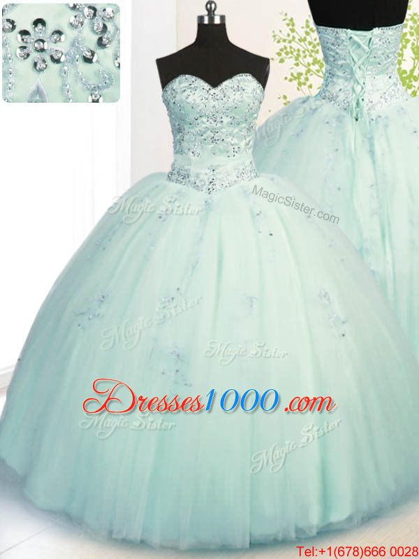 Traditional Sleeveless Tulle Floor Length Lace Up Sweet 16 Quinceanera Dress in Apple Green for with Beading and Appliques