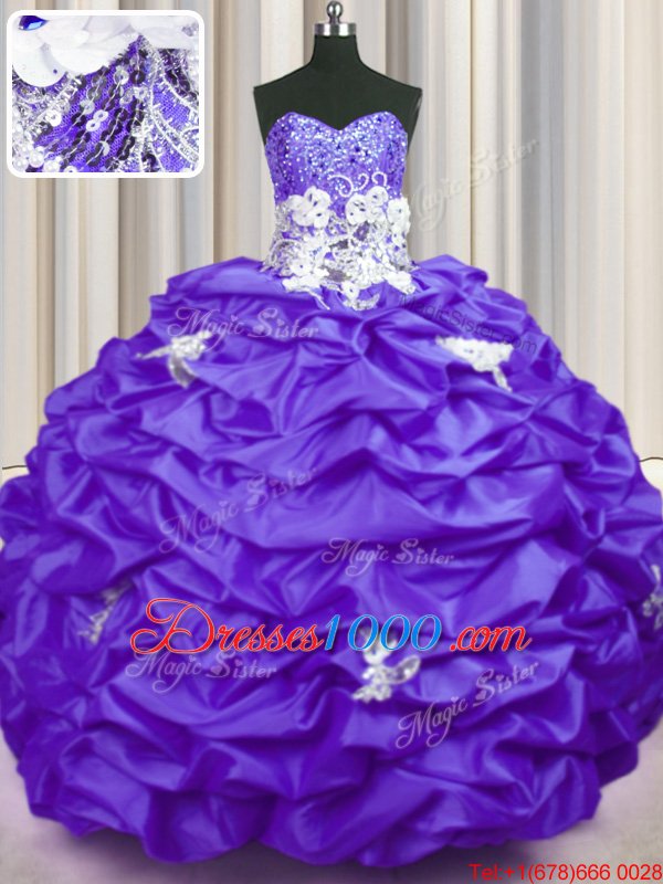 Designer Purple Sleeveless With Train Appliques and Sequins and Pick Ups Lace Up Quinceanera Gown