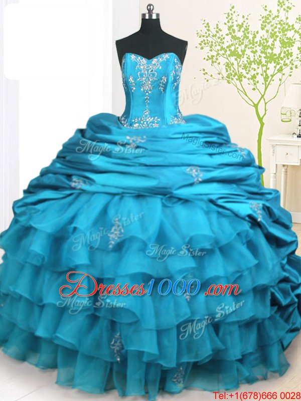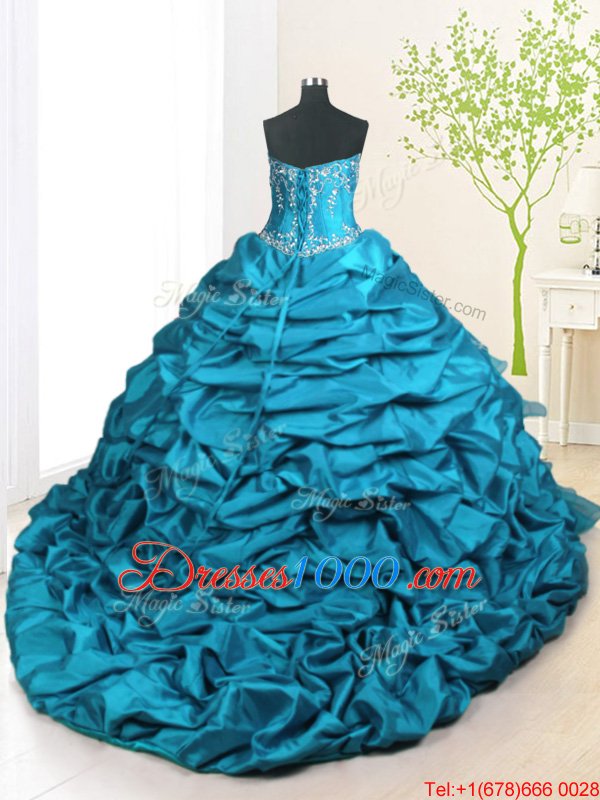 With Train Lace Up Sweet 16 Dress Teal and In for Military Ball and Sweet 16 and Quinceanera with Beading and Appliques and Ruffled Layers and Pick Ups Brush Train