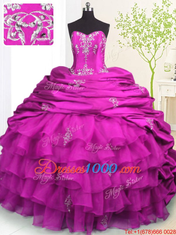 Modern Pick Ups Ruffled Fuchsia Sleeveless Organza and Taffeta Brush Train Lace Up Quinceanera Dresses for Military Ball and Sweet 16 and Quinceanera