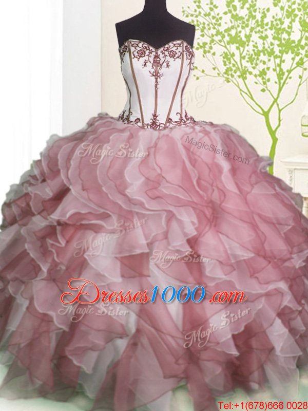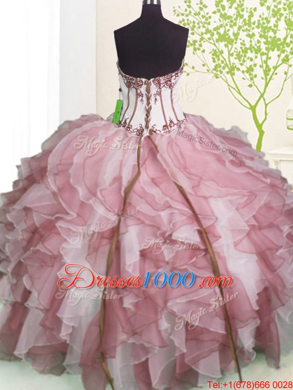 Sleeveless Floor Length Ruffles Lace Up Quinceanera Gowns with Pink And White