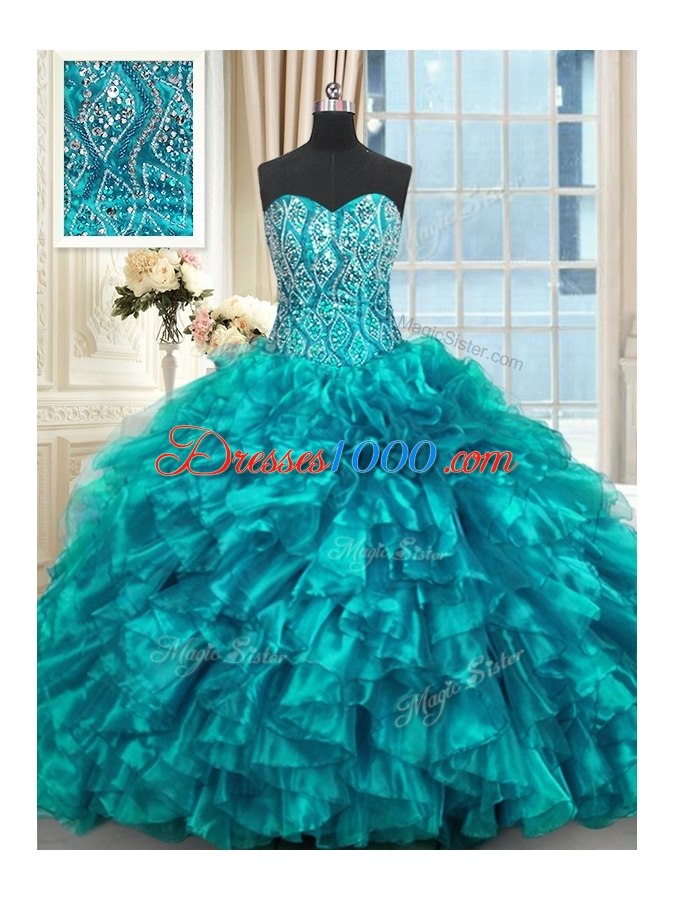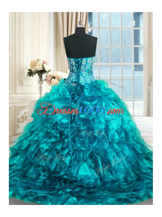 Teal Sleeveless Beading and Ruffles Lace Up Quinceanera Dresses