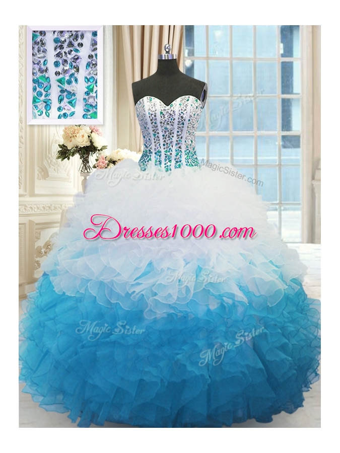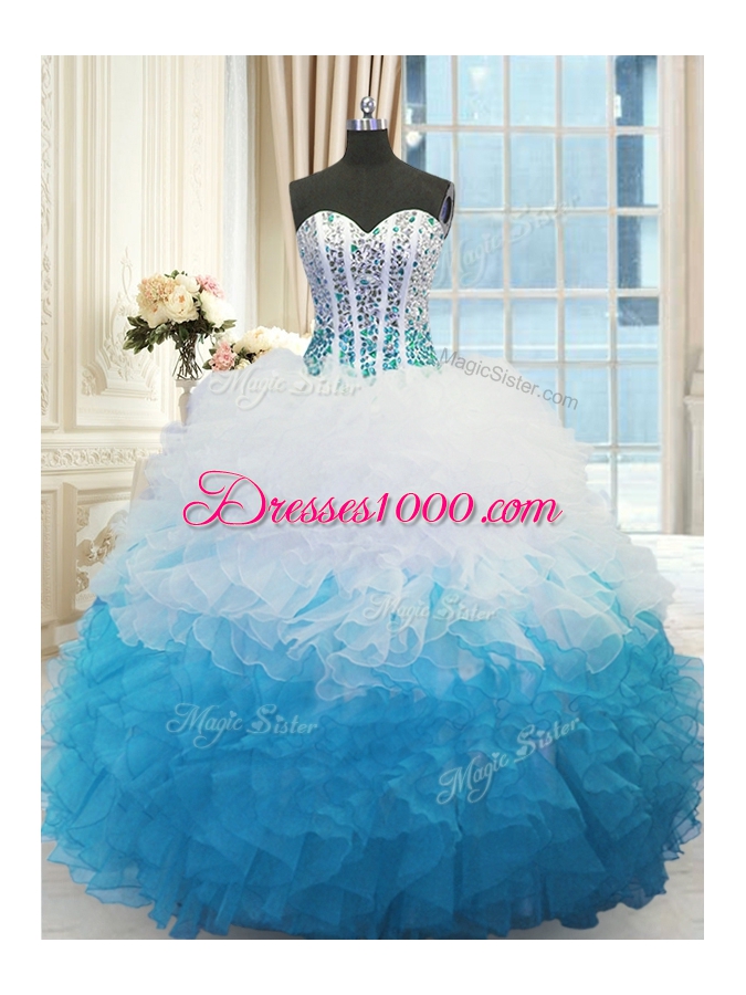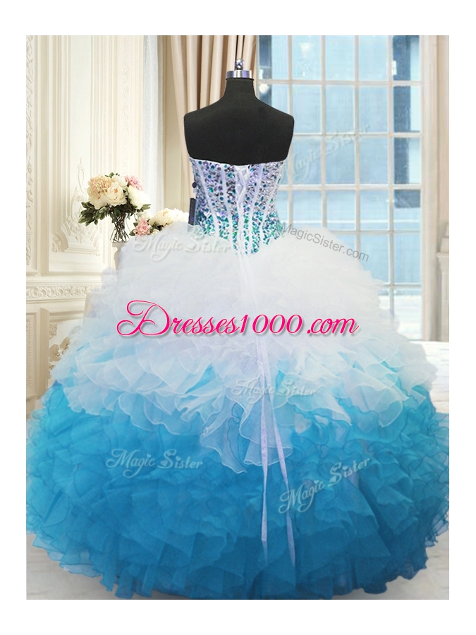 Dramatic Floor Length Ball Gowns Sleeveless Blue And White Sweet 16 Dresses Lace Up