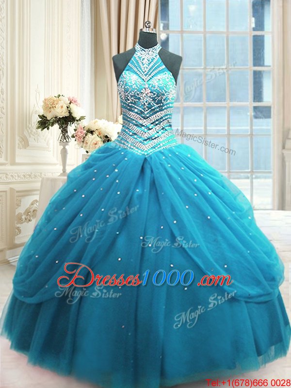 Baby Blue Sleeveless Floor Length Beading Lace Up Quince Ball Gowns